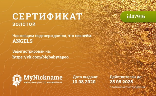 Nickname ANGELS is registered to https://vk.com/bigbabytapeo. Issued certificate ID47916. Issue date 10.08.2020.
