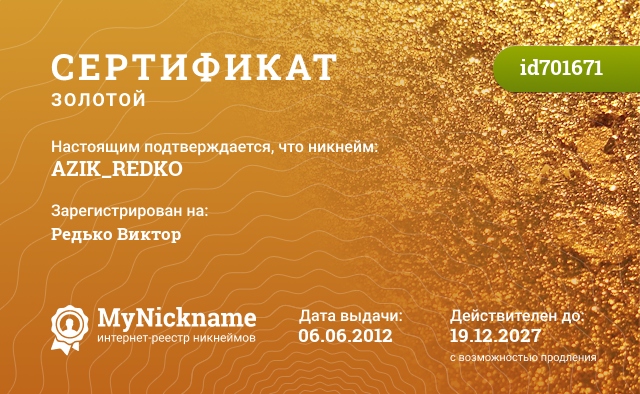 Nickname AZIK_REDKO is registered to Rarely Victor. Issued Gold certificate ID701671. Issue date 06.06.2012.