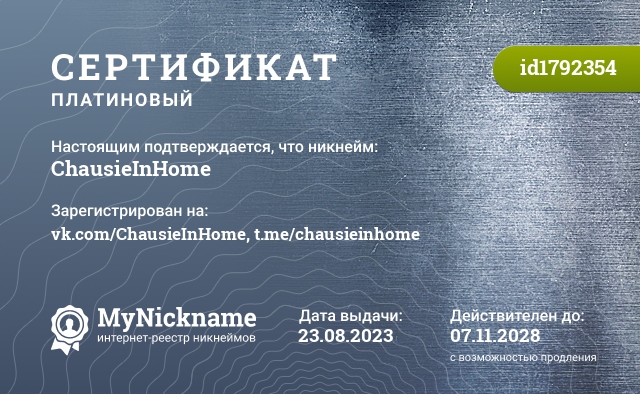 Платиновый ? сертификат на никнейм ChausieInHome (id1792354)