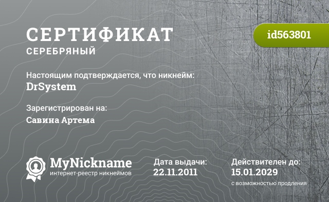 Nickname DrSystem is registered to Savina Artema. Issued certificate ID563801. Issue date 22.11.2011.
