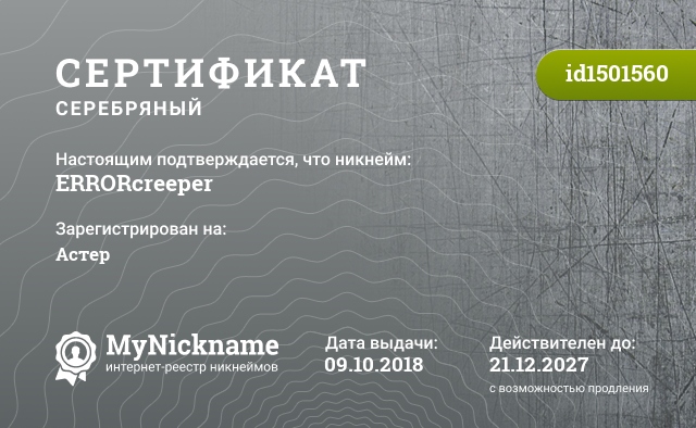 Nickname ERRORcreeper is registered to Aster. Issued certificate ID1501560. Issue date 09.10.2018.