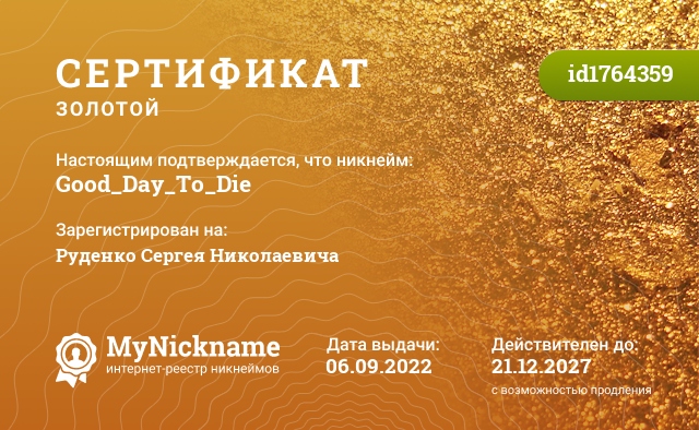 certificate for nickname: Good_Day_To_Die (id1764359)