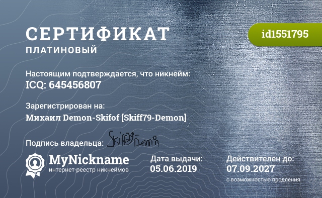 Certificate for nickname ICQ: 645456807 is registered to: Михаил Demon-Skifof [Skiff79-Demon]