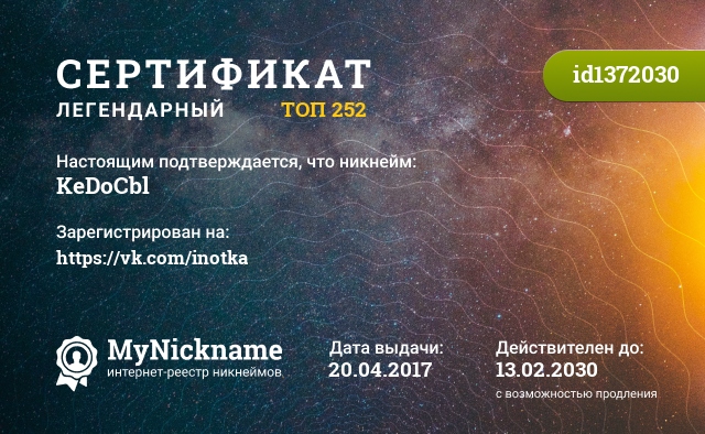Nickname KeDoCbl is registered to https://vk.com/inotka. Issued certificate ID1372030. Issue date 20.04.2017.