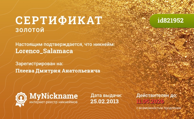 certificate for nickname: Lorenco_Salamaca (id821952)
