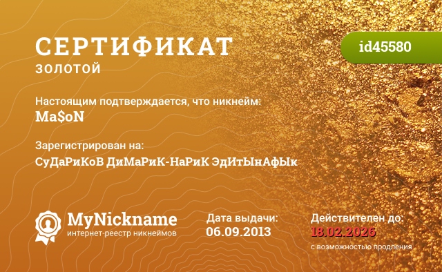 Certificate for nickname Ma$oN is registered to: SUDARYKOV DIMARIK-NARIK EDITINAFYK
