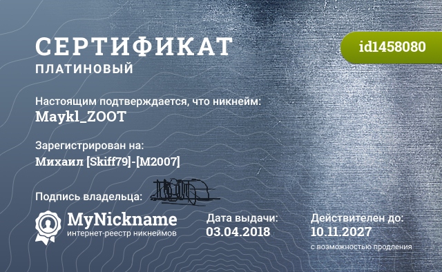 certificate for nickname: Maykl_ZOOT (id1458080)