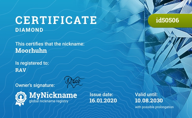 Nickname Moorhuhn is registered to RAV. Issued Diamond certificate ID50506. Issue date 16.01.2020.
