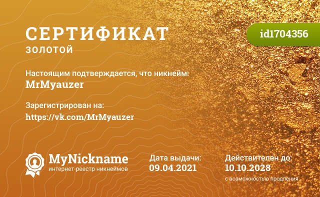 Gold ? certificate for nickname: MrMyauzer (id1704356)