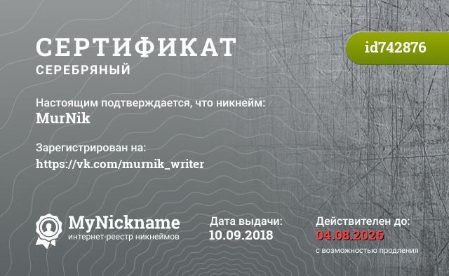 certificate for nickname: MurNik (id742876)