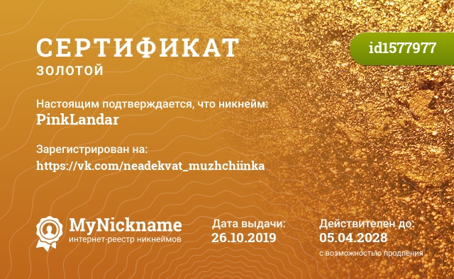 Сертификат на никнейм PinkLandar, зарегистрирован на https://vk.com/neadekvat_muzhchiinka