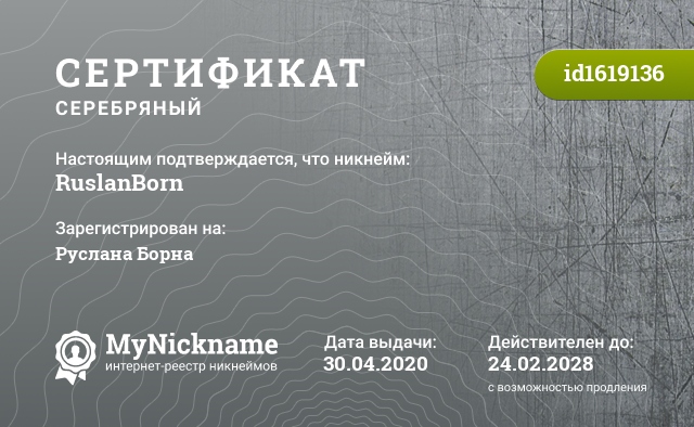 Nickname RuslanBorn is registered to Ruslan Born. Issued certificate ID1619136. Issue date 30.04.2020.