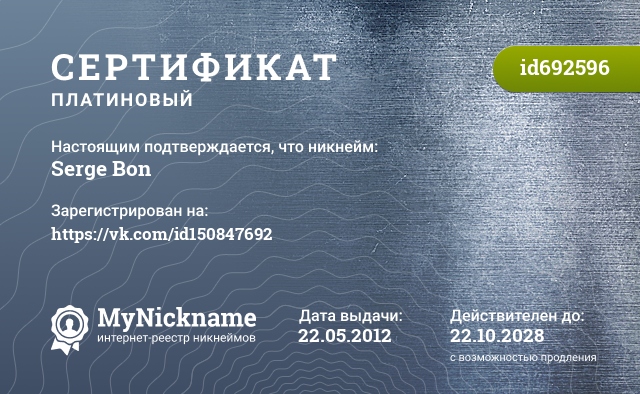 Nickname Serge Bon is registered to https://vk.com/id150847692. Issued certificate ID692596. Issue date 22.05.2012.