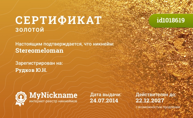 certificate for nickname: Stereomeloman (id1018619)