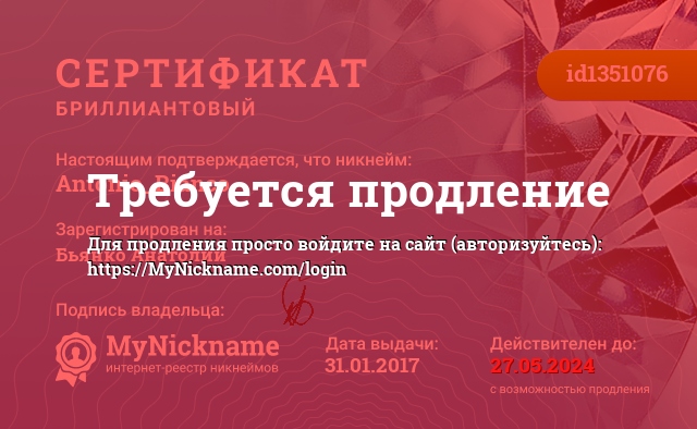 Никнейм Antonio_Bianco зарегистрирован на Бьянко Анатолий. Выдан бриллиантовый сертификат id1351076. Дата выдачи 31.01.2017.