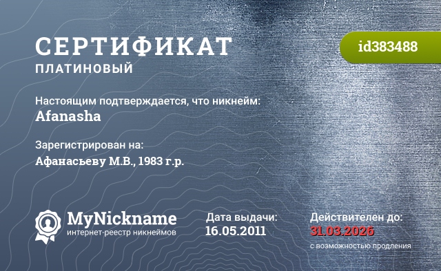 Никнейм Afanasha зарегистрирован на Афанасьеву М.В., 1983 г.р.. Выдан платиновый сертификат id383488. Дата выдачи 16.05.2011.