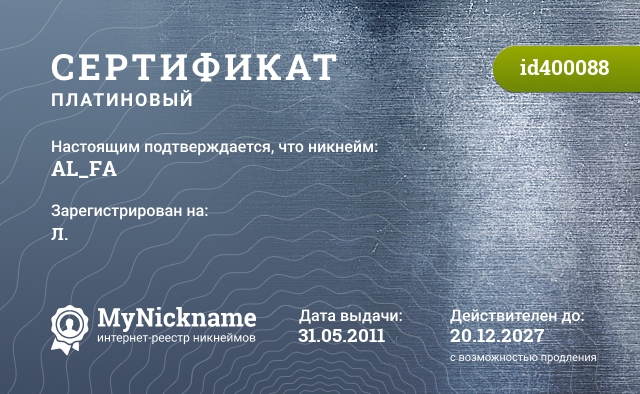 Nickname AL_FA is registered to L.. Issued certificate ID400088. Issue date 31.05.2011.