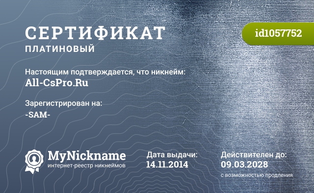 certificate for nickname: All-CsPro.Ru (id1057752)