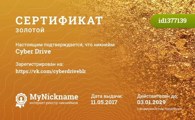 certificate for nickname: Cyber Drive (id1377139)