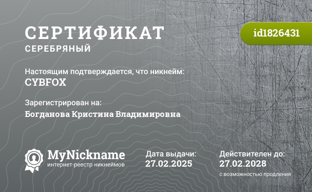 Никнейм CYBFOX зарегистрирован на Богданова Кристина Владимировна. Выдан сертификат id1826431. Дата выдачи 27.02.2025.