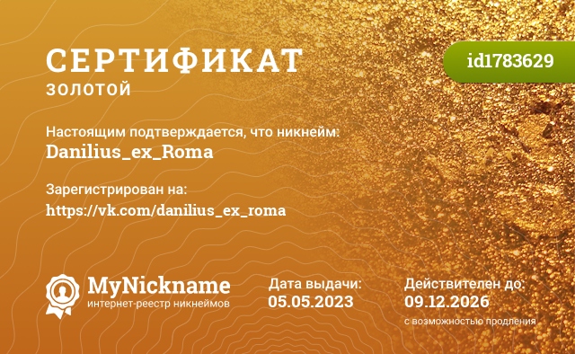 certificate for nickname: Danilius_ex_Roma (id1783629)