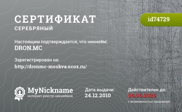 certificate for nickname: DRON.MC (id74729)