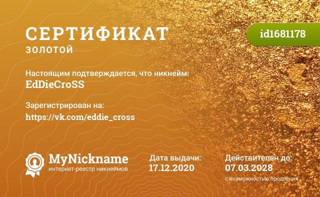 certificate for nickname: EdDieCroSS (id1681178)