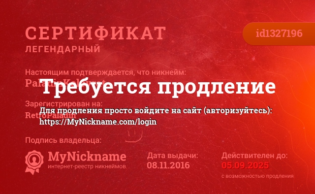 Nickname PaladinKolovrat is registered to RetroPaladin. Issued certificate ID1327196. Issue date 08.11.2016.