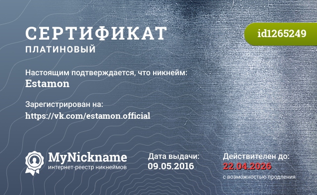 certificate for nickname: Estamon (id1265249)
