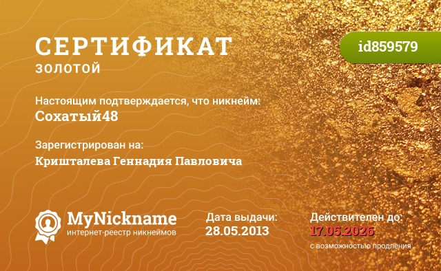 certificate for nickname: Сохатый48 (id859579)