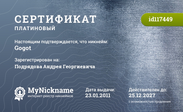 Nickname Gogot is registered to Podryadov Andrey Georgievich. Issued certificate ID117449. Issue date 23.01.2011.