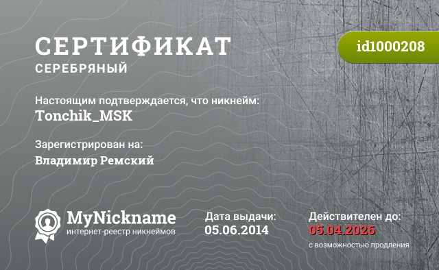 Nickname Tonchik_MSK is registered to Vladimir Remsky. Issued certificate ID1000208. Issue date 05.06.2014.