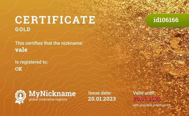 Nickname vale is registered to OK. Issued Gold certificate ID106166. Issue date 20.01.2023.