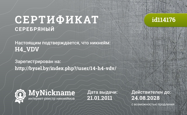 Nickname H4_VDV is registered to http://bysel.by/index.php?/user/14-h4-vdv/. Issued certificate ID114176. Issue date 21.01.2011.