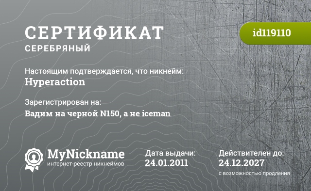 Nickname Hyperaction is registered to Vadim on the black N150, not iceman. Issued Silver certificate ID119110. Issue date 24.01.2011.