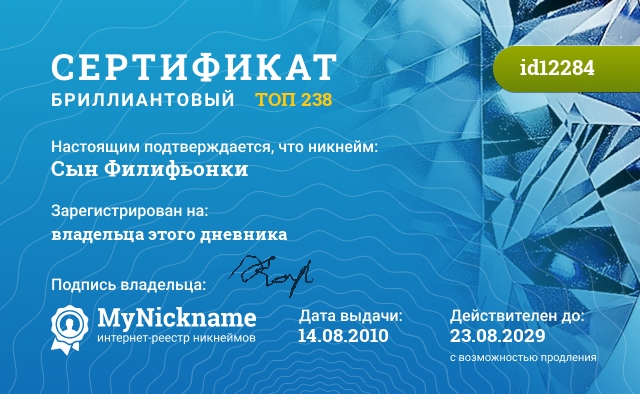 Certificate for nickname Сын Филифьонки is registered to: the owner of this diary