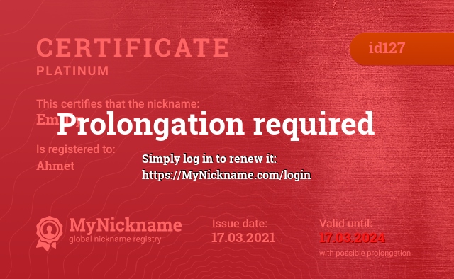 Nickname Emilly is registered to Ahmet. Issued Platinum certificate ID127. Issue date 17.03.2021.