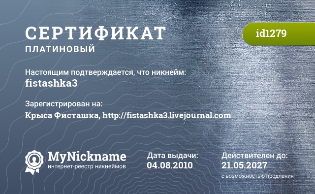 Nickname fistashka3 is registered to Rat Pistachio, http://fistashka3.livejournal.com. Issued certificate ID1279. Issue date 04.08.2010.