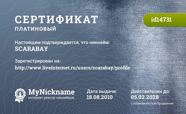 Nickname SCARABAY is registered to http://www.liveinternet.ru/users/scarabay/profile. Issued certificate ID14731. Issue date 18.08.2010.