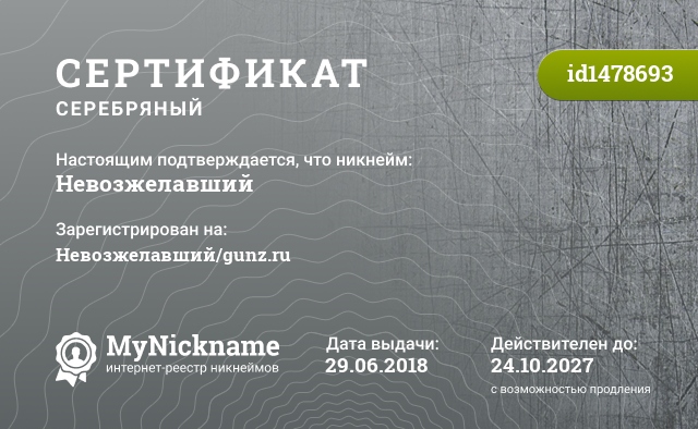 Nickname Невозжелавший is registered to The Unwilling/gunz.ru. Issued certificate ID1478693. Issue date 29.06.2018.