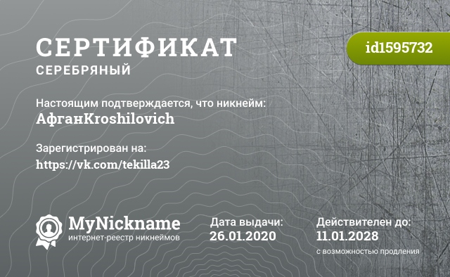 Nickname АфганKroshilovich is registered to https://vk.com/tekilla23. Issued certificate ID1595732. Issue date 26.01.2020.