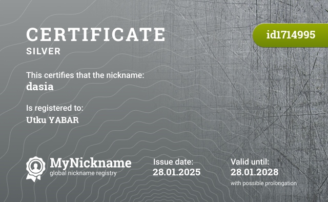 Nickname dasia is registered to Utku YABAR. Issued certificate ID1714995. Issue date 28.01.2025.