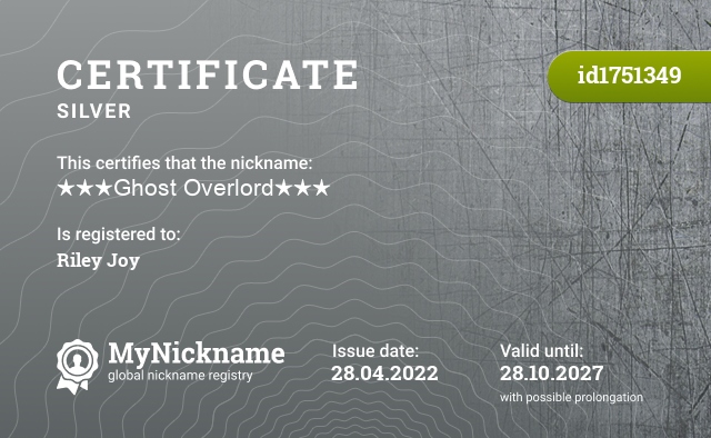 certificate for nickname: ★★★Ghost Overlord★★★ (id1751349)