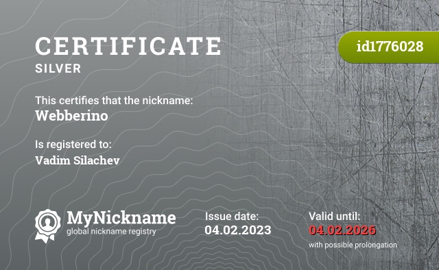 Nickname Webberino is registered to Vadim Silachev. Issued certificate ID1776028. Issue date 04.02.2023.