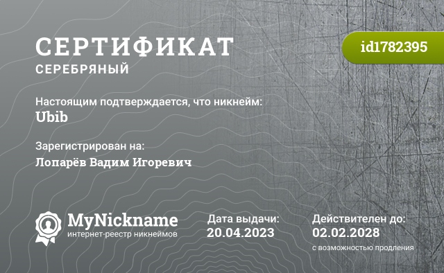Nickname Ubib is registered to Loparev Vadim Igorevich. Issued certificate ID1782395. Issue date 20.04.2023.