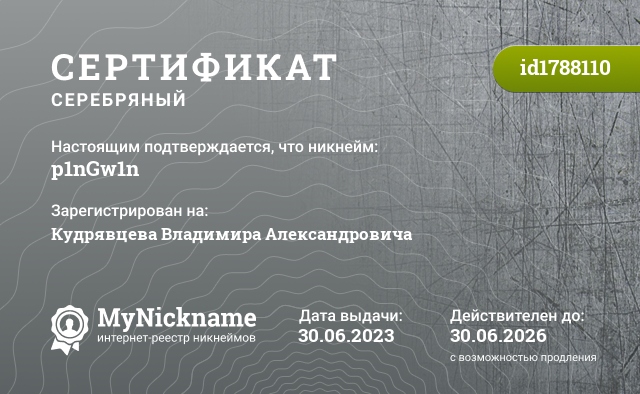 Nickname p1nGw1n is registered to Kudryavtsev Vladimir Alexandrovich. Issued Silver certificate ID1788110. Issue date 30.06.2023.