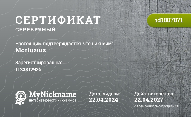 Nickname Morluzius is registered to 1123812926. Issued Silver certificate ID1807871. Issue date 22.04.2024.