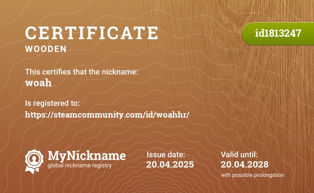 Nickname woah is registered to https://steamcommunity.com/id/woahhr/. Issued certificate ID1813247. Issue date 20.04.2025.