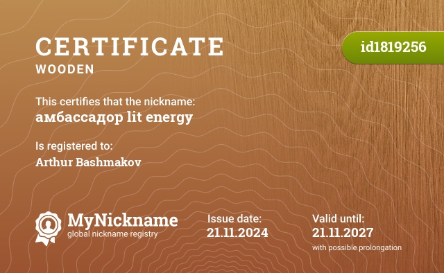 Nickname амбассадор lit energy is registered to Arthur Bashmakov. Issued Wooden certificate ID1819256. Issue date 21.11.2024.
