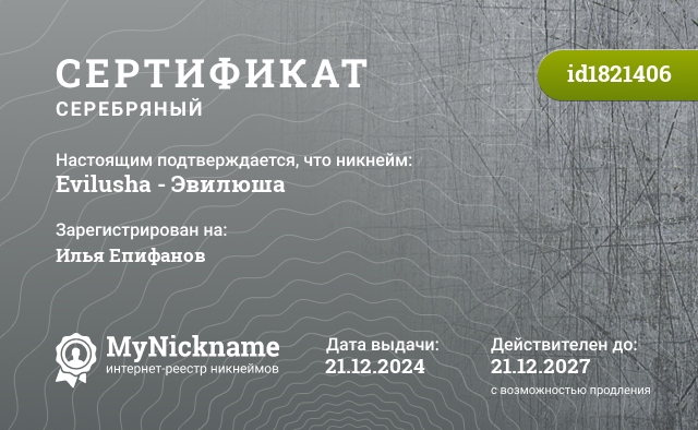 Nickname Evilusha - Эвилюша is registered to Ilya Epifanov. Issued certificate ID1821406. Issue date 21.12.2024.
